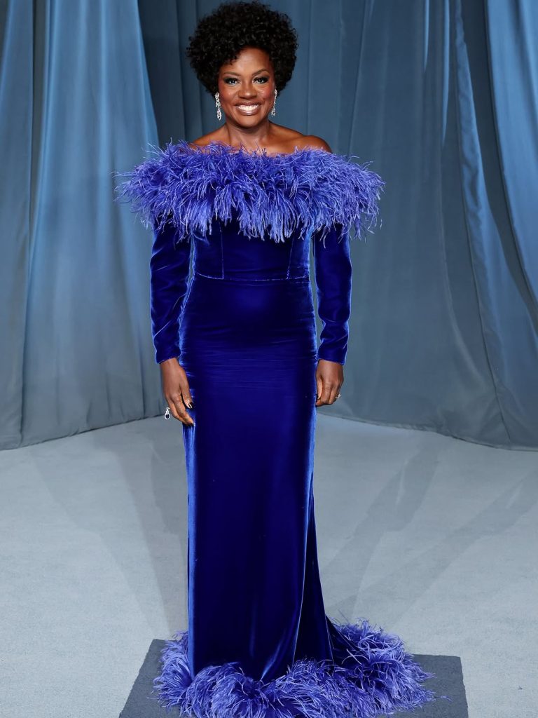 A nossa adorável atriz- Viola Davis estava deslumbrante com um vestido azul-meia-noite de veludo da grife Gucci, com detalhes em penas na gola e na cauda.