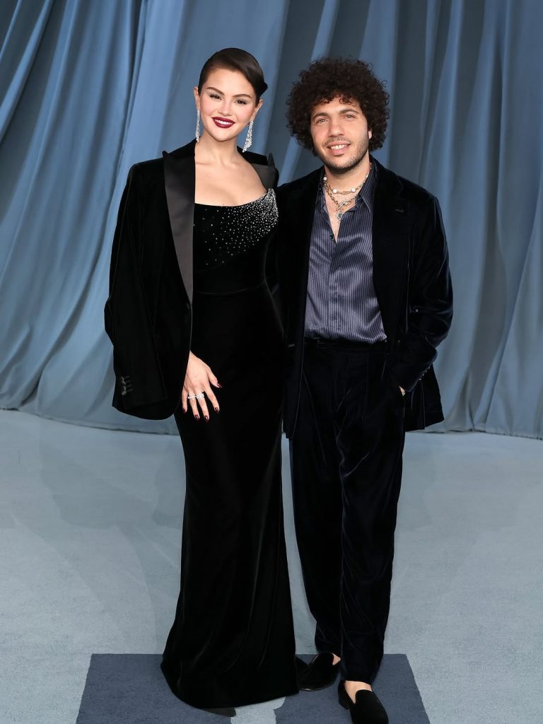 Selena e Blanco usaram trajes pretos de veludo da Giorgio Armani. Ela escolheu um vestido preto de veludo da coleção Privé, com cristais na gola e um casaco de veludo, complementado por joias de diamantes da De Beers. Já Blanco usou um terno de veludo azul.
