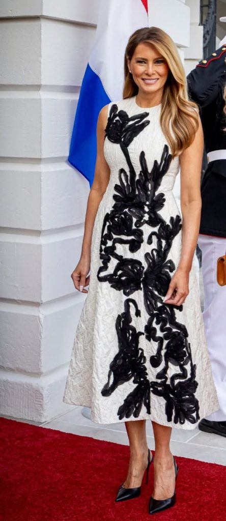 Já Melania manteve sua assinatura minimalista, em um vestido midi em tom off-white, de silhueta estruturada e comprimento abaixo do joelho, que remete à estética refinada da alta-costura. O tecido, levemente texturizado, ganha protagonismo através de aplicações florais em relevo na cor preta, criando um contraste gráfico marcante.