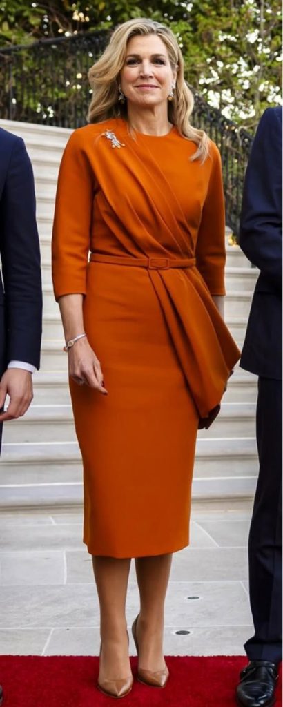 Máxima apostou em um visual de glamour moderno com toque royal, escolhendo um vestido midi de corte estruturado que valoriza a silhueta com sofisticação e sobriedade.