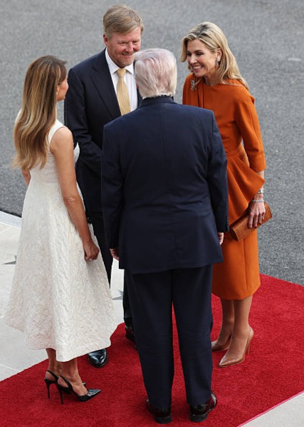 Máxima com sua expressividade refinada e Melania com sua estética calculada e atemporal — Ambos estilos resulta em um visual que dialoga com o cenário diplomático sem abrir mão de personalidade — uma escolha que reafirma o poder da moda como linguagem silenciosa de autoridade.