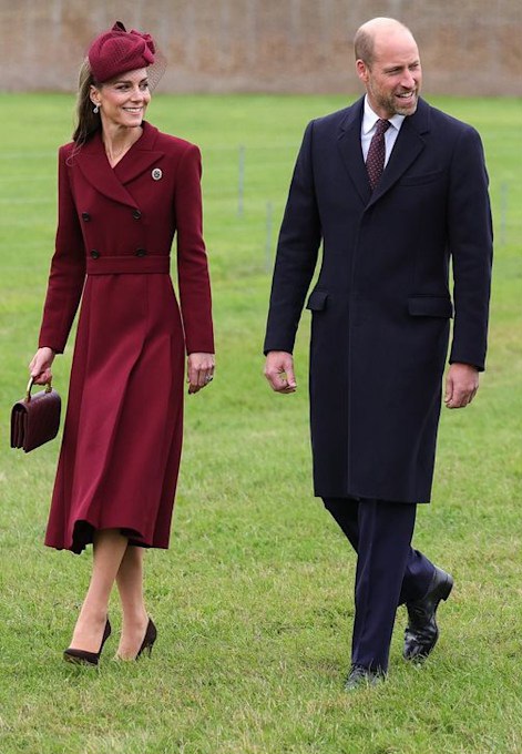 A princesa Kate estava igualmente glamourosa com um vestido bordô Emilia Wickstead, combinado com o chapéu “Neso” de Jane Taylor.