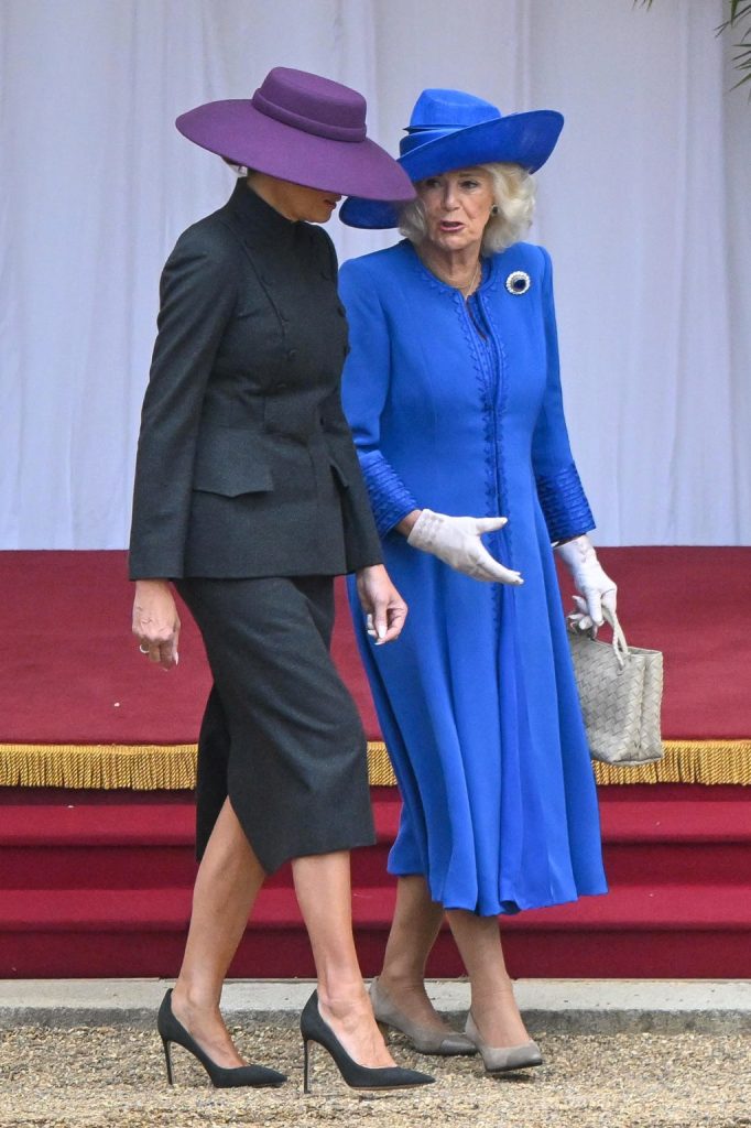Melania Trump adotou um visual atemporal e elegante ao chegar a Windso. Ela usou um terno cinza escuro Christian Dior Haute Couture com decote alto e cintura marcada, combinado com scarpins de camurça cinza escuro combinando. Ela adicionou um toque de cor marcante ao conjunto monocromático com um elegante chapéu de lã violeta.